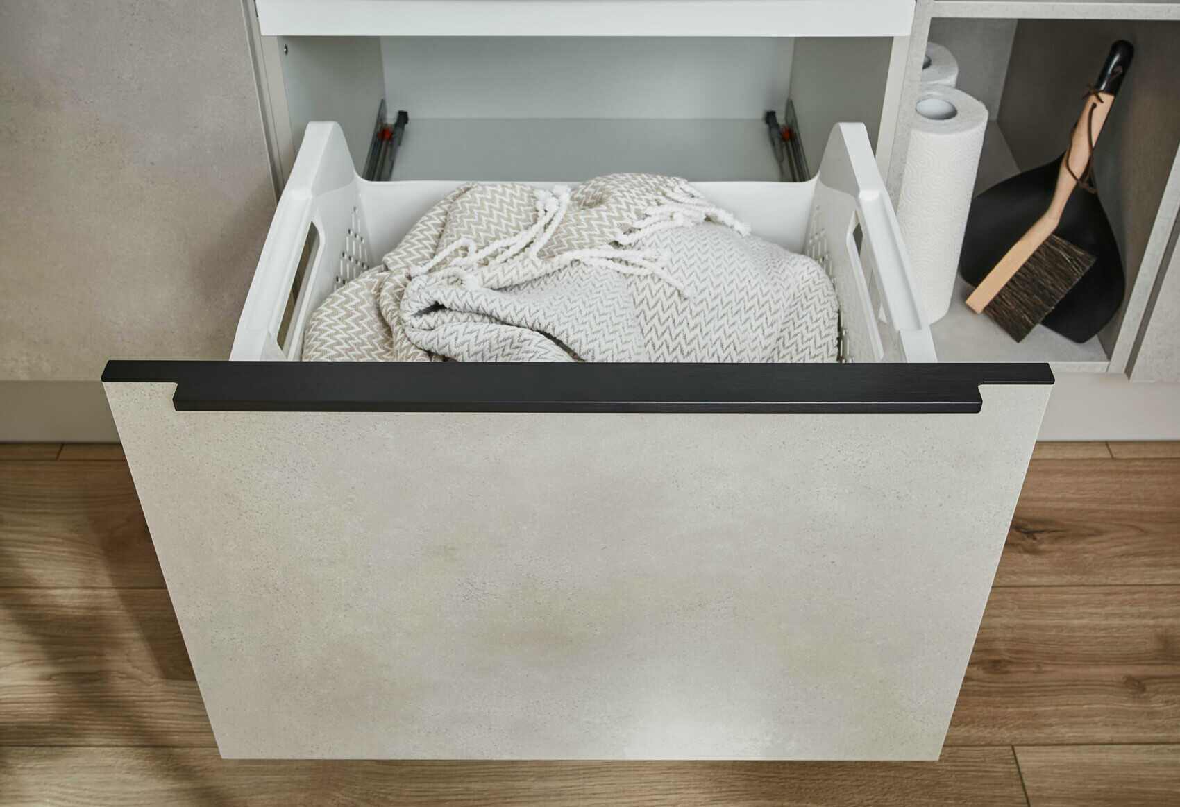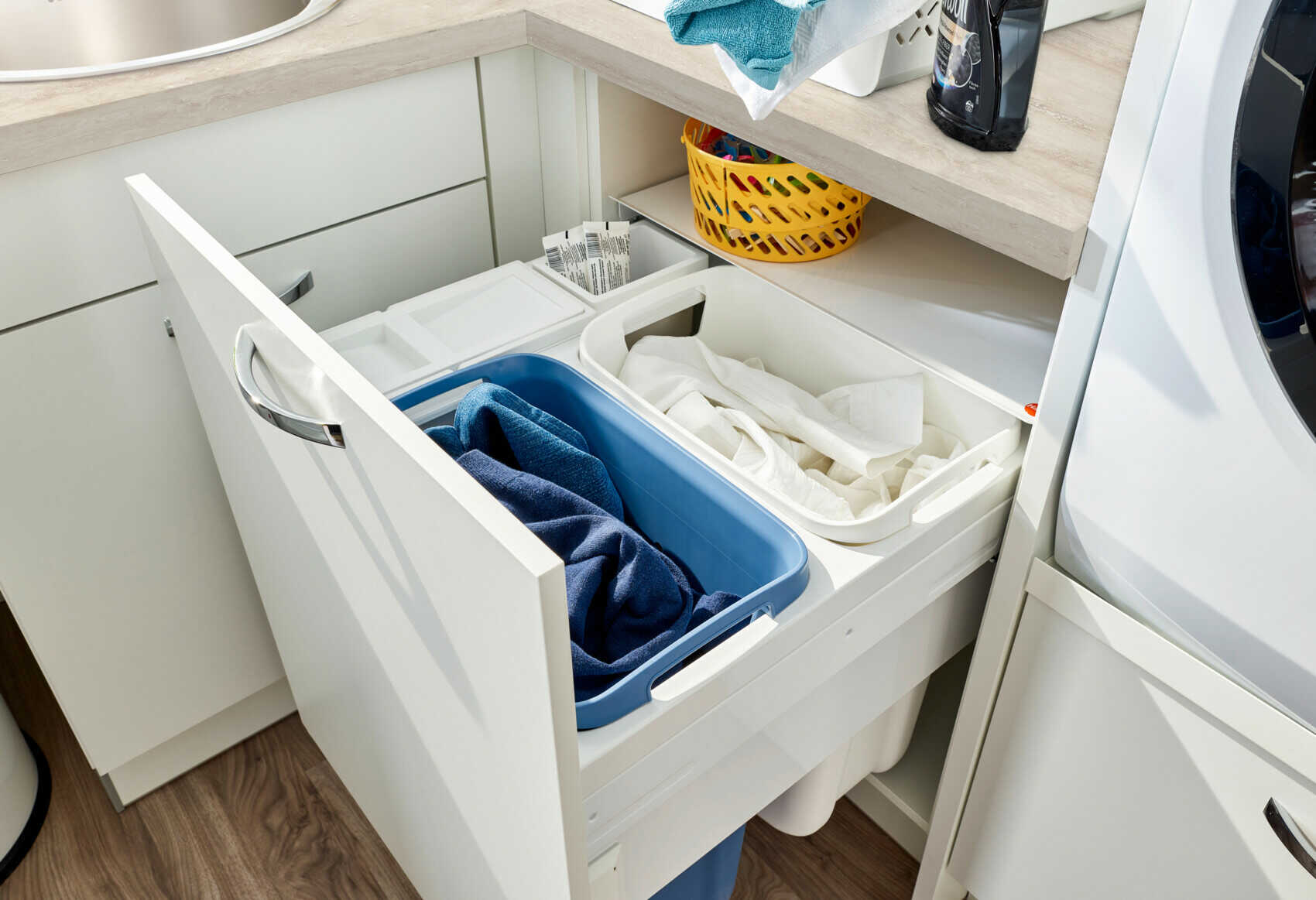 Výsuvný šuplík na koš na prádlo. Jeden hmat a už je špinavé prádlo v bubnu!