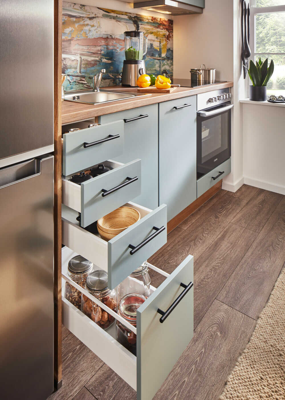 Making optimal use of limited kitchen space and selecting the perfect worktop creates a stunning result. Your kitchen should be designed to be functional and provide enough storage space – with the main focus on food prep and cooking. The versatile worktop allows you to prepare meals conveniently all in the one place, although it can get a little cramped if carrying out several tasks at once. This being said, smaller kitchen layouts are cosy and create a wonderfully harmonious effect.
