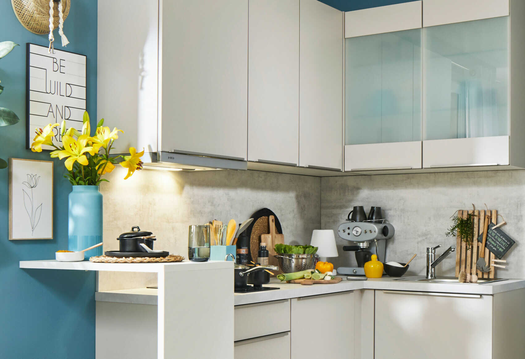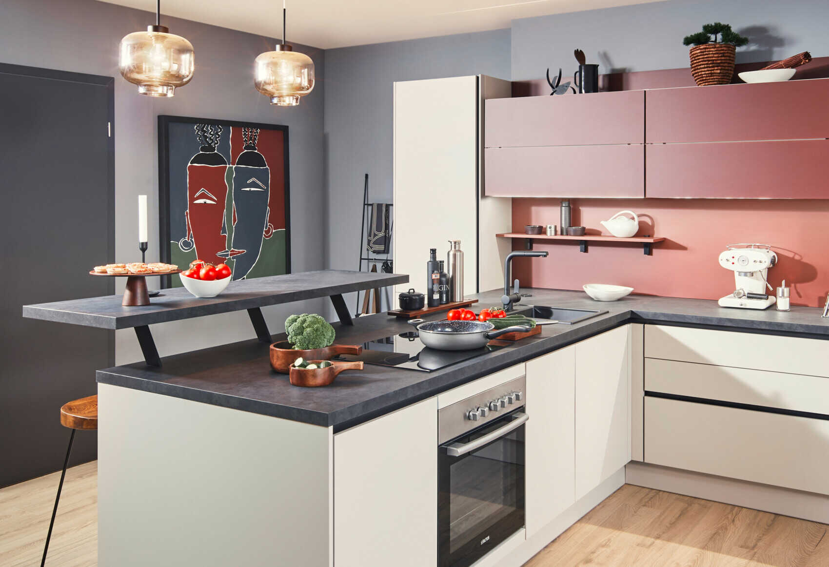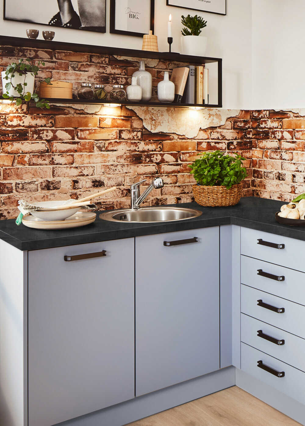 Pale worktops can help make a kitchen look larger and airier. Dark work surfaces, on the other hand, lend a kitchen a cosier atmosphere.
