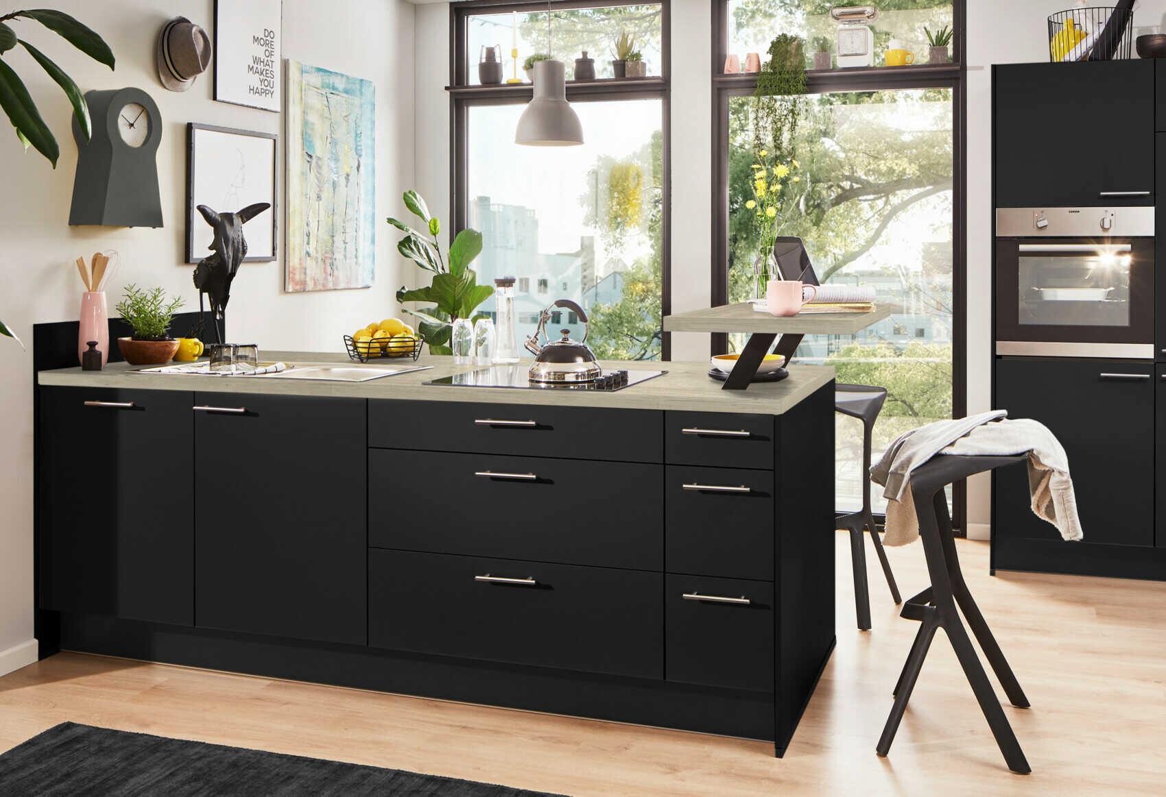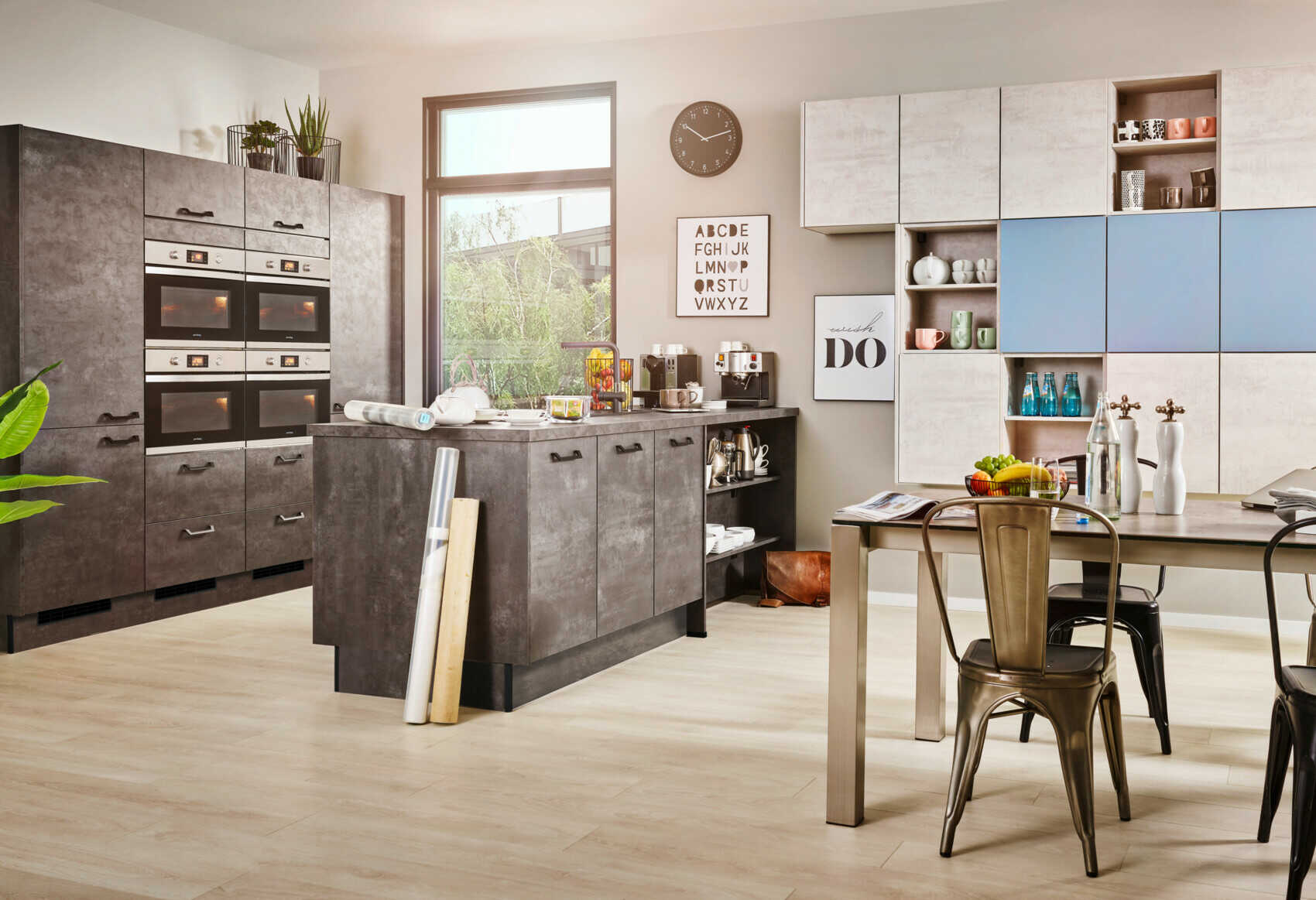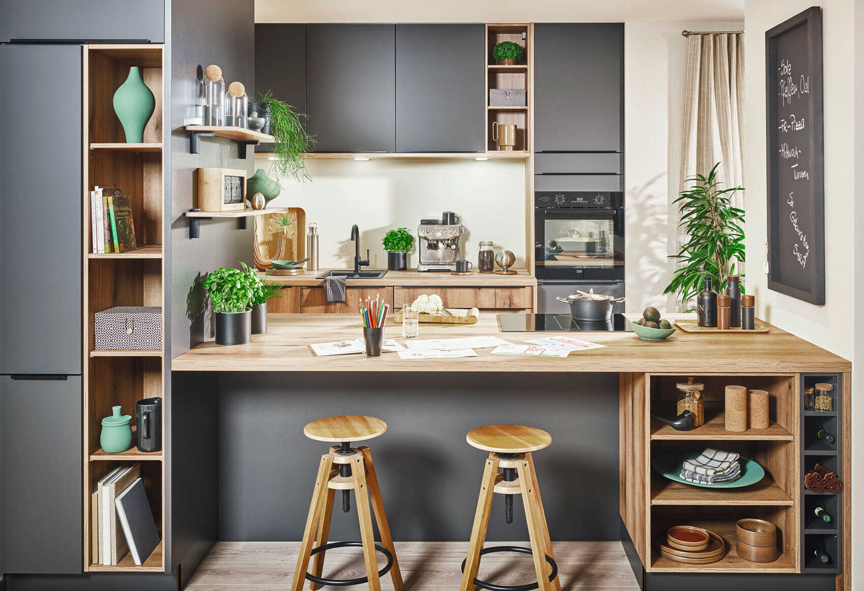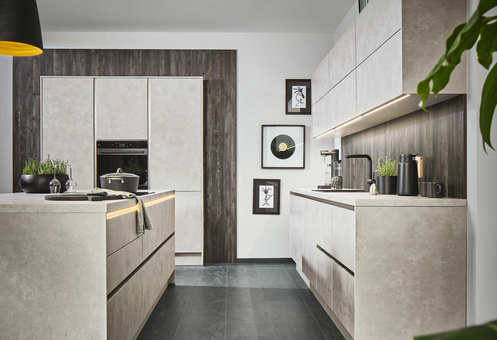 Concrete-effect finishes complement a minimalistic, urban style and reinforce the kitchen’s modern aesthetics. The sleek lines and simple elegance of dark wood finishes come wonderfully into their own in minimalistic kitchens.