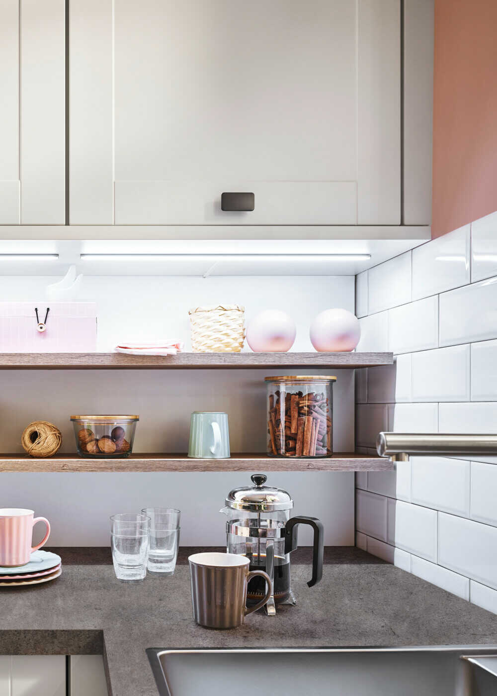 Dans une kitchenette, le plan de travail imitation béton assure une mise en scène épurée et fournit une surface solide.